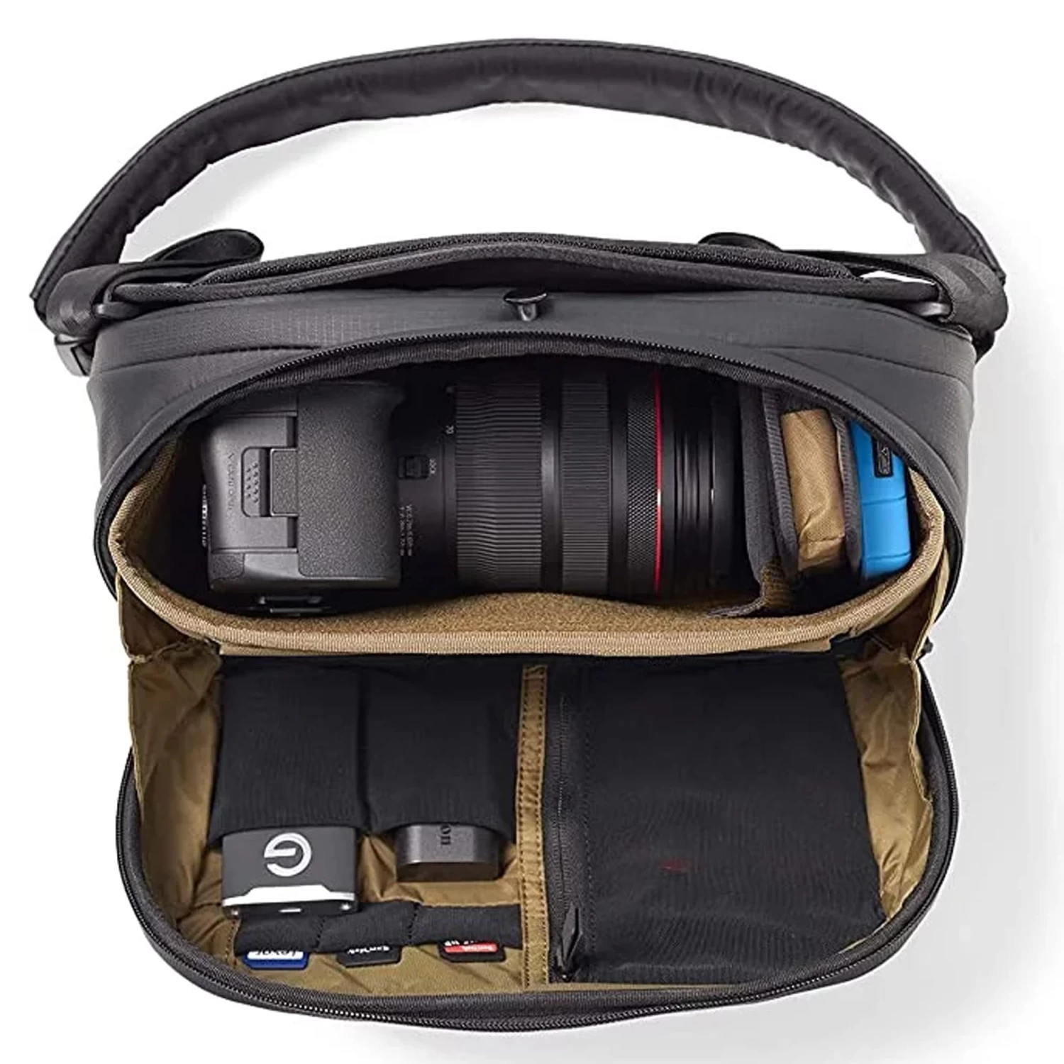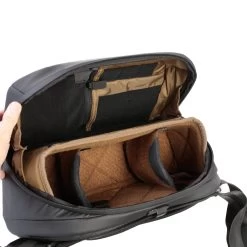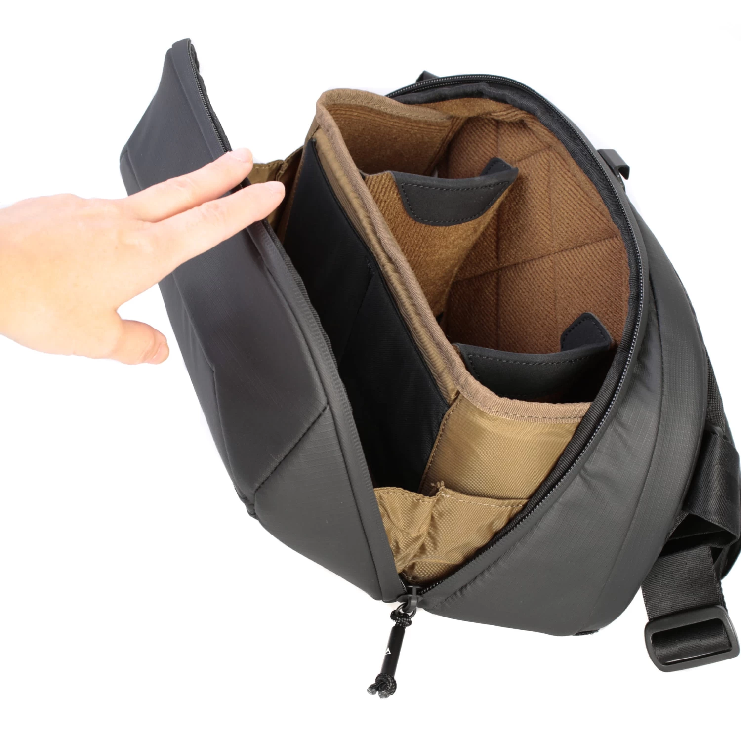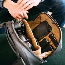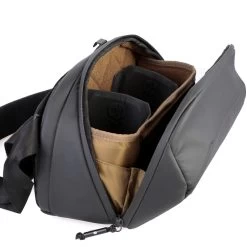 Die Ă–ffnung ist anders als z.B. bei den Everyday Slings von Peak Design konzipiert. Das zeigt sich, wenn du die Tasche aufklappst: Im Kamerafach bilden stabile Seitenwände einen eigenen Rahmen, das Fach ist auch bei weit offener Tasche nach auĂźen abgesichert. Der Vorteil liegt auf der Hand: du kannst die Tasche weit aufklappen, weil das Fach formstabil bleibt. Die offene Klappe bildet eine Halbschale, die zur Ablagefläche wird – ein absoluter Gamechanger. Endlich werden Objektivwechsel schnell und sicher. Denn anders als bei den meisten anderen TaschenFragen wie “,Wohin mit dem Objektiv, dem Deckel oder dem FilterËś sind damit endlich geklärt.