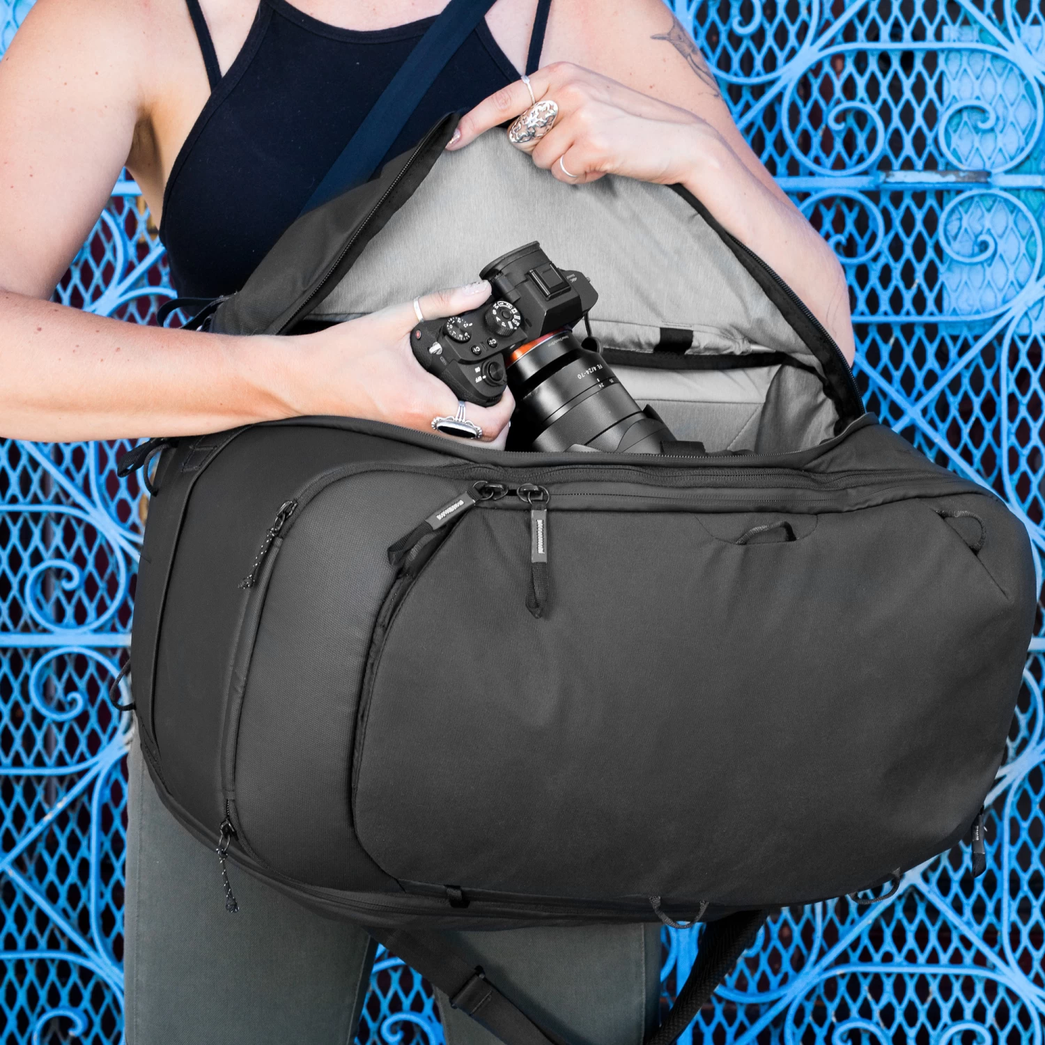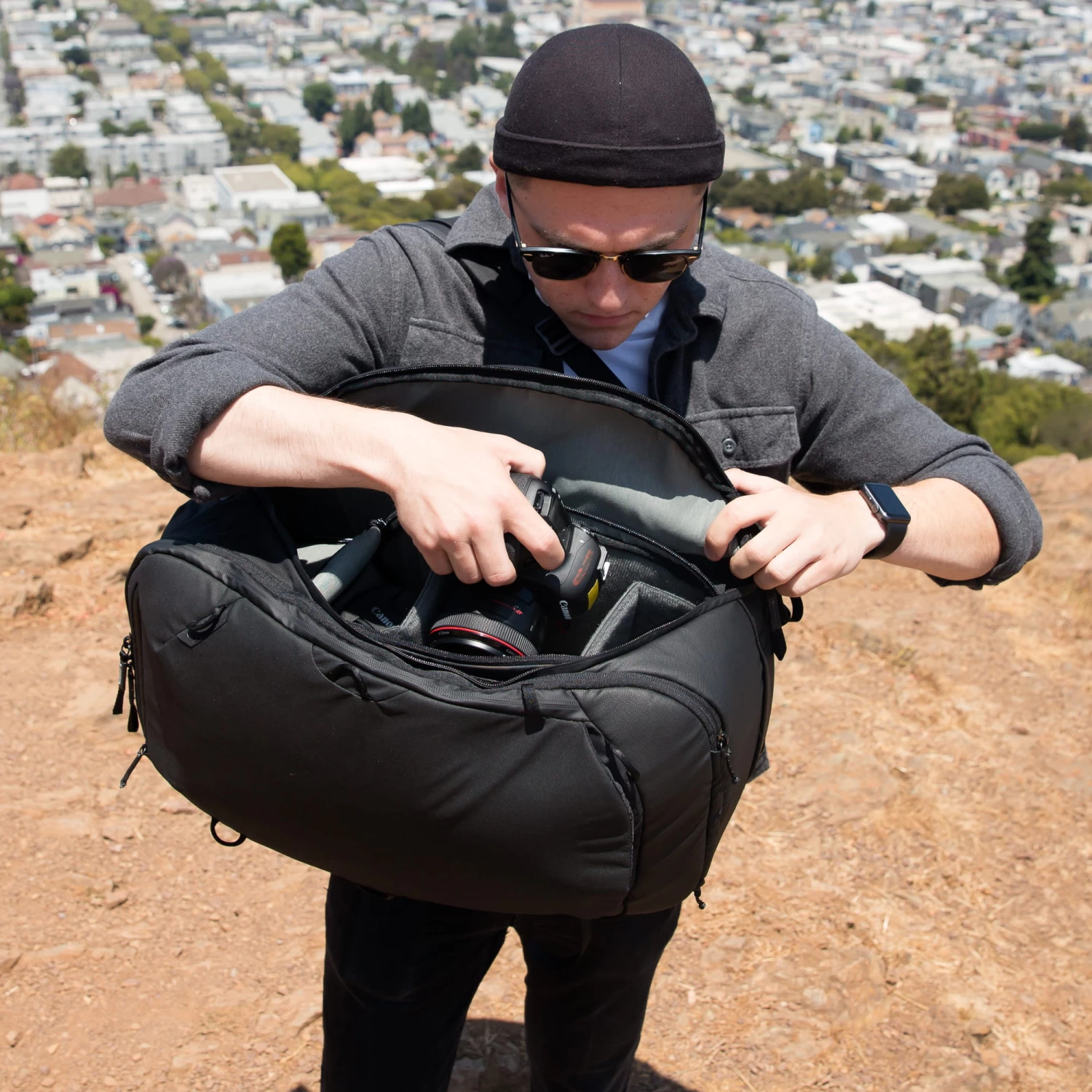 An der Außenseite des Würfels befinden sich mehrere Schlaufen. Diese besitzen eine Doppelfunktion. Im Innenraum des Travel Backpack 45 L gibt es passende Gegenstücke. Mithilfe der sogenannten C-Clips kannst du den Würfel im Rucksack festmachen, damit er nicht rausfallen kann. Aber fast noch wichtiger: An den Schlaufen lässt sich ein Peak-Design-Kameragurt festmachen, was den Cube in eine Fototasche verwandelt. So hast du am auch am Ziel deiner Reise eine Fototasche zu Verfügung, ohne dass du zusätzlich eine mitnehmen musst.