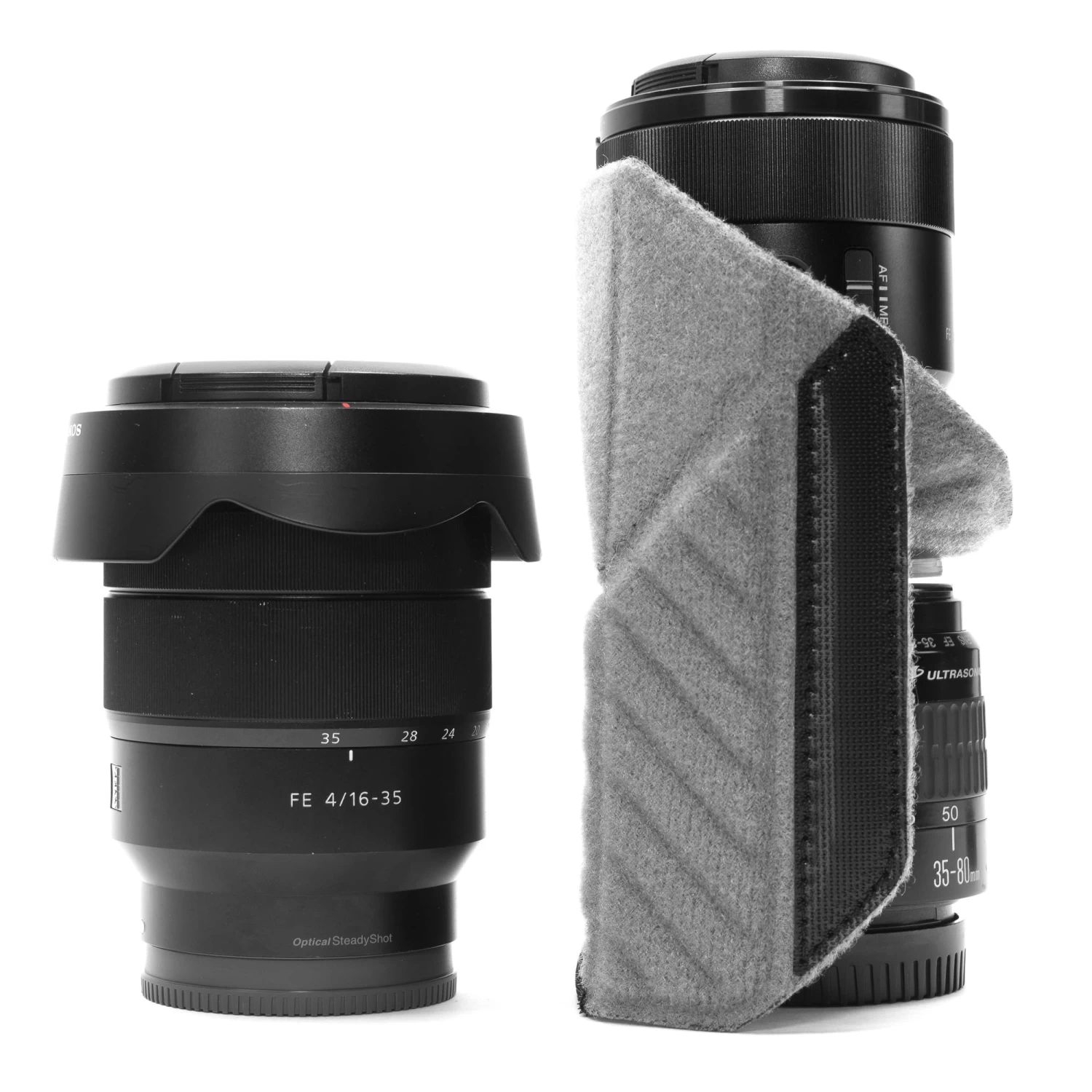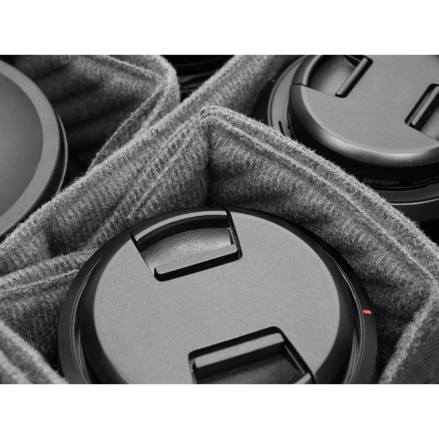 Mit dabei ist eine Variation von FlexFold-Kletteinteilern. Das sind zwei lange Einteiler, fünf kurze Einteiler und drei regalartige Falteineiler. Alle Einteiler sind per Klett befestigt. Du kannst sie verwenden, um das Innenfach für deine individuellen Bedürfnisse anzupassen. Die beiden Regaleinteiler bieten hierbei eine enorme Vielseitigkeit. Ihr besonderes Feature ist ein innovatives Faltdesign mit einer doppellagigen Hälfte. Du kannst die Einteiler ausgeklappt lassen, um lange Objektive zu stützen. Und wenn du eine Lage um 90 Grad umklappst, schaffst du eine Art Regal mit einem Zwischenboden. Jeder der beiden Falteinteiler kann ein langes Objektiv stützen und gleichzeitig zwei übereinander gestapelte Objektive voneinander trennen.