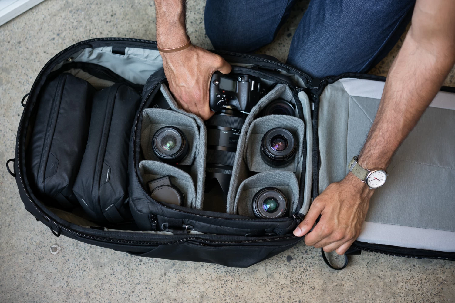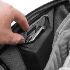 An der Außenseite des Würfels befinden sich mehrere Schlaufen. Diese besitzen eine Doppelfunktion. Im Innenraum des Travel Backpack 45 L gibt es passende Gegenstücke. Mithilfe der sogenannten C-Clips kannst du den Würfel im Rucksack festmachen, damit er nicht rausfallen kann. Aber fast noch wichtiger: An den Schlaufen lässt sich ein Peak-Design-Kameragurt festmachen, was den Cube in eine Fototasche verwandelt. So hast du am auch am Ziel deiner Reise eine Fototasche zu Verfügung, ohne dass du zusätzlich eine mitnehmen musst.