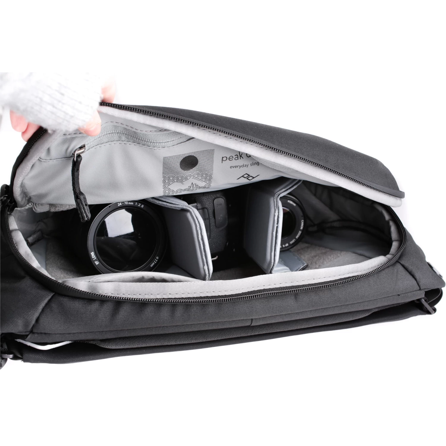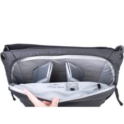 Fast schon ein Markenzeichen von Peak Design: Anders als bei anderen Taschen lassen sich die Everydays noch flexibler einteilen und anpassen. Der Clou dahinter: die FlexFold-Teiler! Die Entwickler von Peak Design haben das Konzept an japanische Origami-Techniken angelehnt. Mit diesem innovativen Design aus zwei Lagen Stoff ist der Einteiler nicht nur einfach faltbar, sondern doppelt ausklappbar: Eine Lage des Teilers lässt sich umklappen, während die andere Lage ausgeklappt bleibt. So bekommst du eine Art Regal mit einem Zwischenboden. Der Einteiler kann ein langes Objektiv stützen und gleichzeitig zwei übereinander gestapelte Objektive voneinander trennen. So ergibt sich eine Vielzahl von Verstaumöglichkeiten, was die Everyday Sling trotz ihrer kompakten Maße erstaunlich geräumig werden lässt.