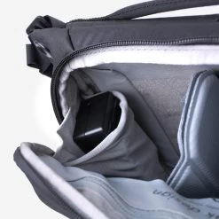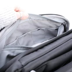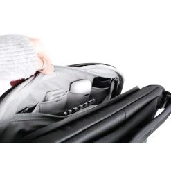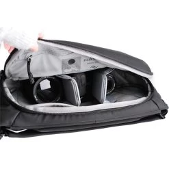 Das Design der Tasche setzt auf ein geräumiges Hauptfach. Eine Vollformat-Kamera mit angesetztem Zoomobjektiv und eine weitere groĂźe Linse passen problemlos. Größere DSLM-Kameras wie die verschiedenen Modelle der Sony-a7-Serie oder eine Fuji X-T3 lassen noch Raum fĂĽr bis zu zwei Wechselobjektive. Abgesehen davon fasst die Tasche auch eine Drohne wie die DJI Mavic Pro inklusive der dazugehörigen Fernbedienung. Wenn der mitgelieferte FlexFold-Teiler (mehr dazu siehe unten) stattdessen als “,RegalbodenËś gefaltet wird, können neben einem groĂźen Zoom auch zwei Festbrennweiten “,gestapeltËś werden. Du kannst die FlexFold-Teiler natĂĽrlich auch ganz entfernen und die Tasche dann fĂĽr alles Mögliche nutzen – die professionelle Fototasche passt sich also ganz deinen AlltagsbedĂĽrfnissen an. Tablets mit bis zu 13 Zoll Bildschirmdiagonale passen komfortabel in ein stabiles Extrafach an der dem Körper zugewandten Seite und im Innenfutter der Deckelklappe ist ein langes ReiĂźverschlussfach mit 4 kleinen Einsteckfächern, um fĂĽr Ordnung bei Akkus, Speicherkarten und Kabeln zu sorgen. Die Cord-Hook-Haltegurte können hier ebenfalls sicher aufbewahrt werden. NatĂĽrlich gibt es auch noch ein Einsteckfach an der AuĂźenseite, hier können Dinge wie dein Smartphone oder eine Brieftasche aufbewahrt werden.