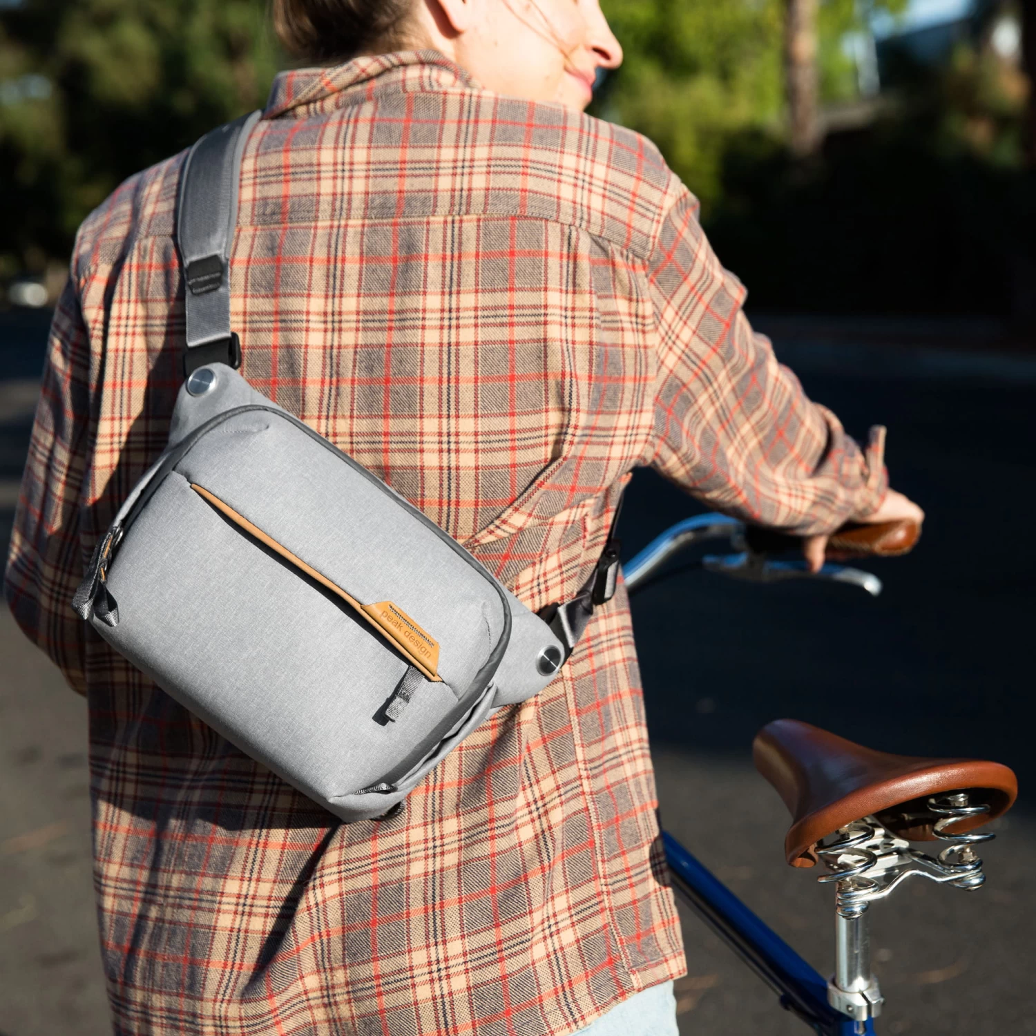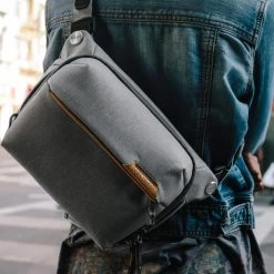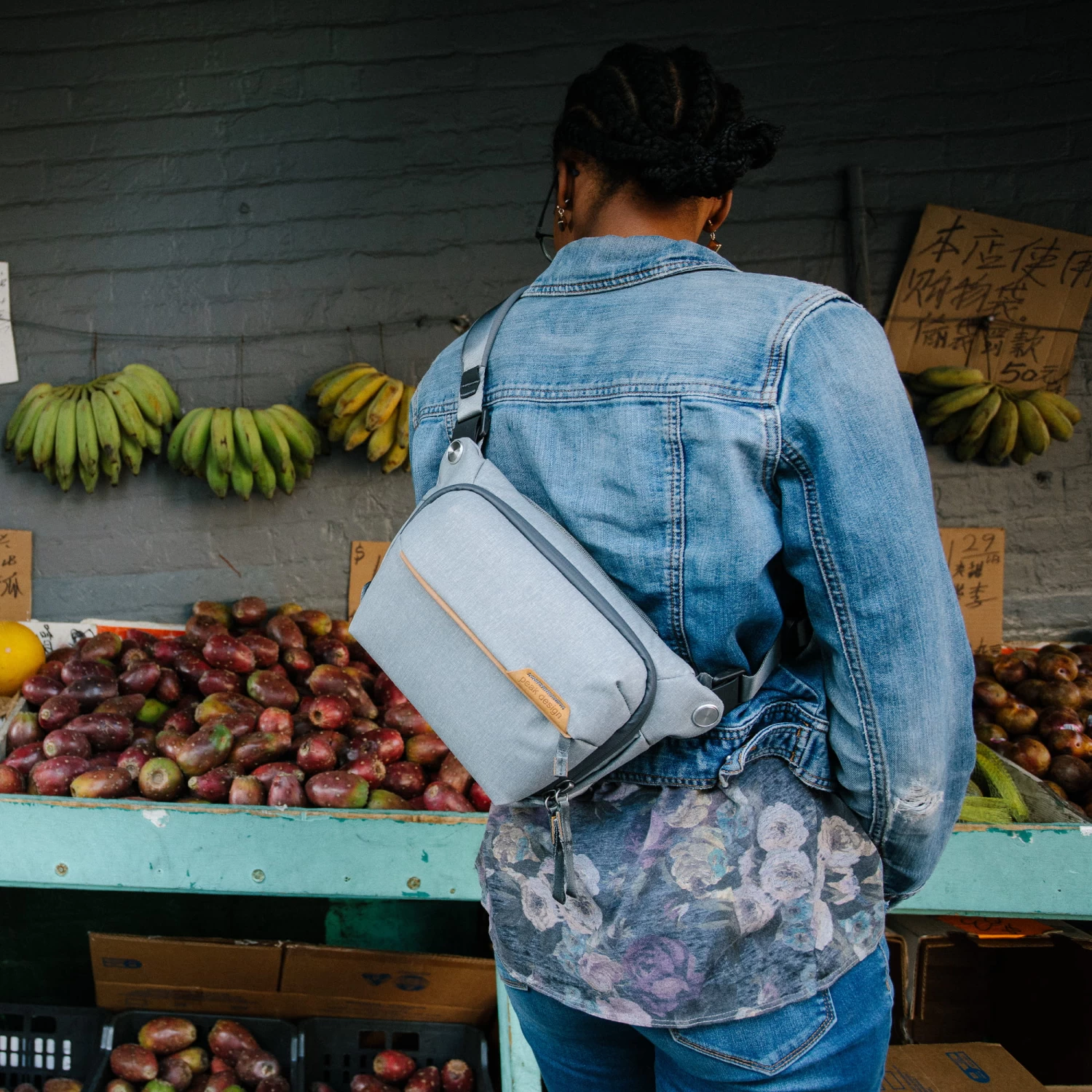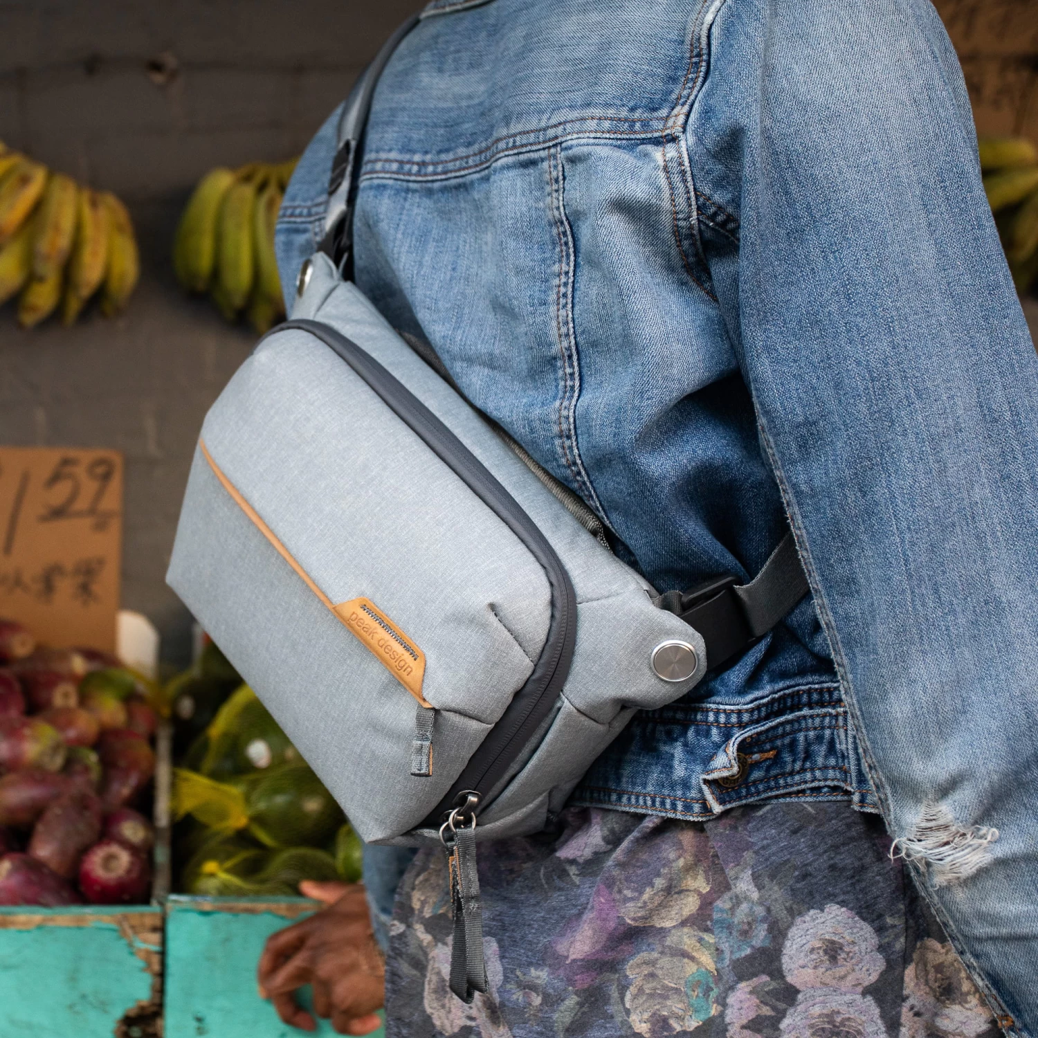 Die aus robustem, wasserfestem Nylon gefertigte Tasche kann auf unterschiedliche Art getragen werden. Als Umhängetasche passt sich die Everyday Sling 3L bequem dem Körper an. Ein gepolsterter Schultergurt mit Drehgelenken sorgt für einen optimalen Sitz, die Länge kann zusätzlich mit dem bewährten Peak-Design-Schnellverschluss beliebig angepasst werden. Dank eines schicken Karabiner-Clips aus eloxiertem Aluminum kann der gepolsterte Teil des Tragegurts geöffnet und vom Schultergurt getrennt werden. Sicher in der Halteöse eingeklinkt, wird die Tasche so im Handumdrehen zur Hüfttasche, die Gurtenden werden im Futteral verstaut.