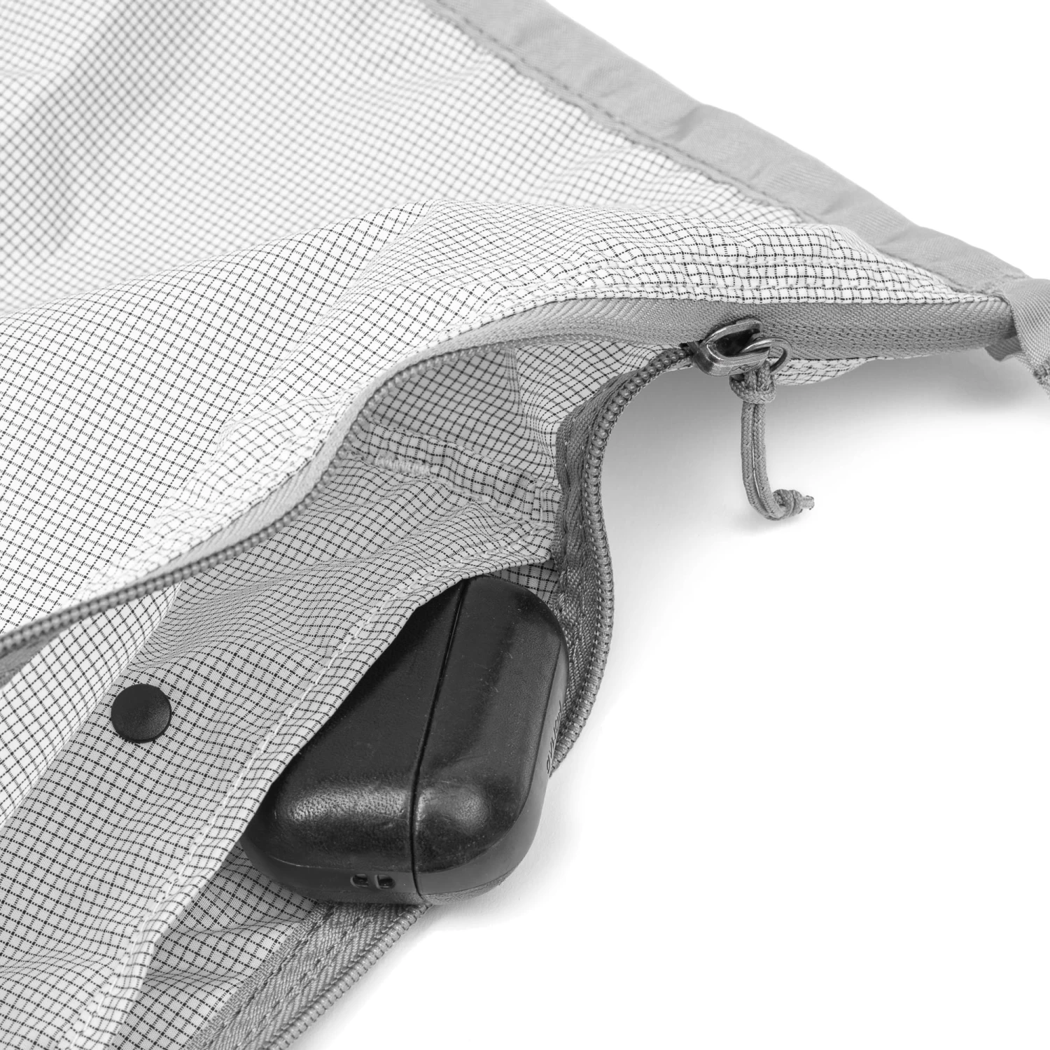 Wer kennt es nicht bei ähnliche Taschen oder anderen Faltgegenständen: ein separater Beutel geht leicht verloren. Oft ist es auch beinahe unmöglich, das Ganze wieder klein genug zusammenzubekommen. Probleme, die Peak Design wie gewohnt elegant löst. Der Beutel ist fest im Innenfutter der Tasche. Beim Zusammenrollen wird diese umgedreht und eingestülpt, bis der Beutel per Druckknopf fest verschlossen werden kann. Der etwa faustgroße Ballen findet dann in jeder Tasche Platz. Wenn die Tasche benutzt wird, passt ein kleineres Handy in das entsprechende Futteral (iPhone 12/13 Pro passt, Pro Max passt nicht).