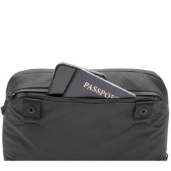 An der Vorderseite der Tech Pouch befindet sich ein flaches Reißverschlussfach, in dem du deinen Reisepass oder dein Smartphone verstauen kannst, damit einen schnellen Zugriff darauf hast. Ein besonderer Clou ist der Kabeldurchlass. Du kannst dein Smartphone per Kabel mit einer Powerbank im Innenfach der Tasche verbinden, um es aufzuladen.