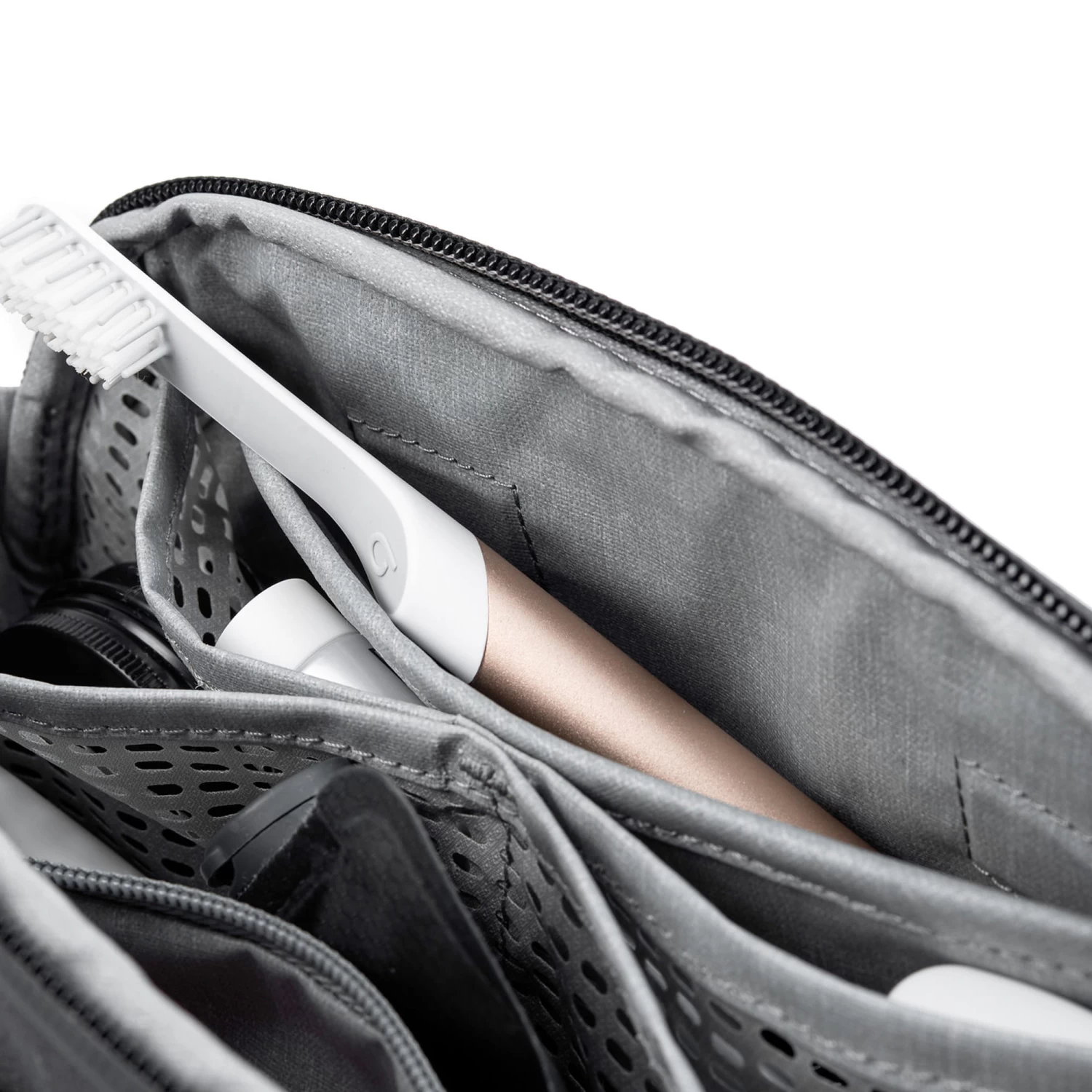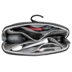 Die kleinere Version der Wash Pouch eignet sich fĂĽr kĂĽrzere Touren oder wenn du mit besonders leichtem Gepäck unterwegs sein willst. Genug Platz fĂĽr die Essentials ist vorhanden: ZahnbĂĽrste, Rasierzubehör, Deo – und auch auf Netzfächer fĂĽr kleine Pflegeartikel muss man nicht verzichten. Bewährte Details werden auĂźerdem von der größeren Version ĂĽbernommen:Der kräftige Alu-Haken zum Aufhängen und das magnetische, leicht zu reinigende ZahnbĂĽrstenfach. Die ewige Frage „Wohin mit der feuchten ZahnbĂĽrste“ ist damit fĂĽr alle Zeiten geklärt. Das Hauptfach wird per Netzteiler in zwei Seiten unterteilt, mit zwei zusätzlichen seitlichen Nebenfächern. AuĂźerdem steht ein ReiĂźverschlussfach zur VerfĂĽgung. AuĂźerdem ist die Wash Pouch auch ein Modul des Travel-Line-PackwĂĽrfel-Systems, so dass sie sich nahtlos in den Backpack 45L integriert.